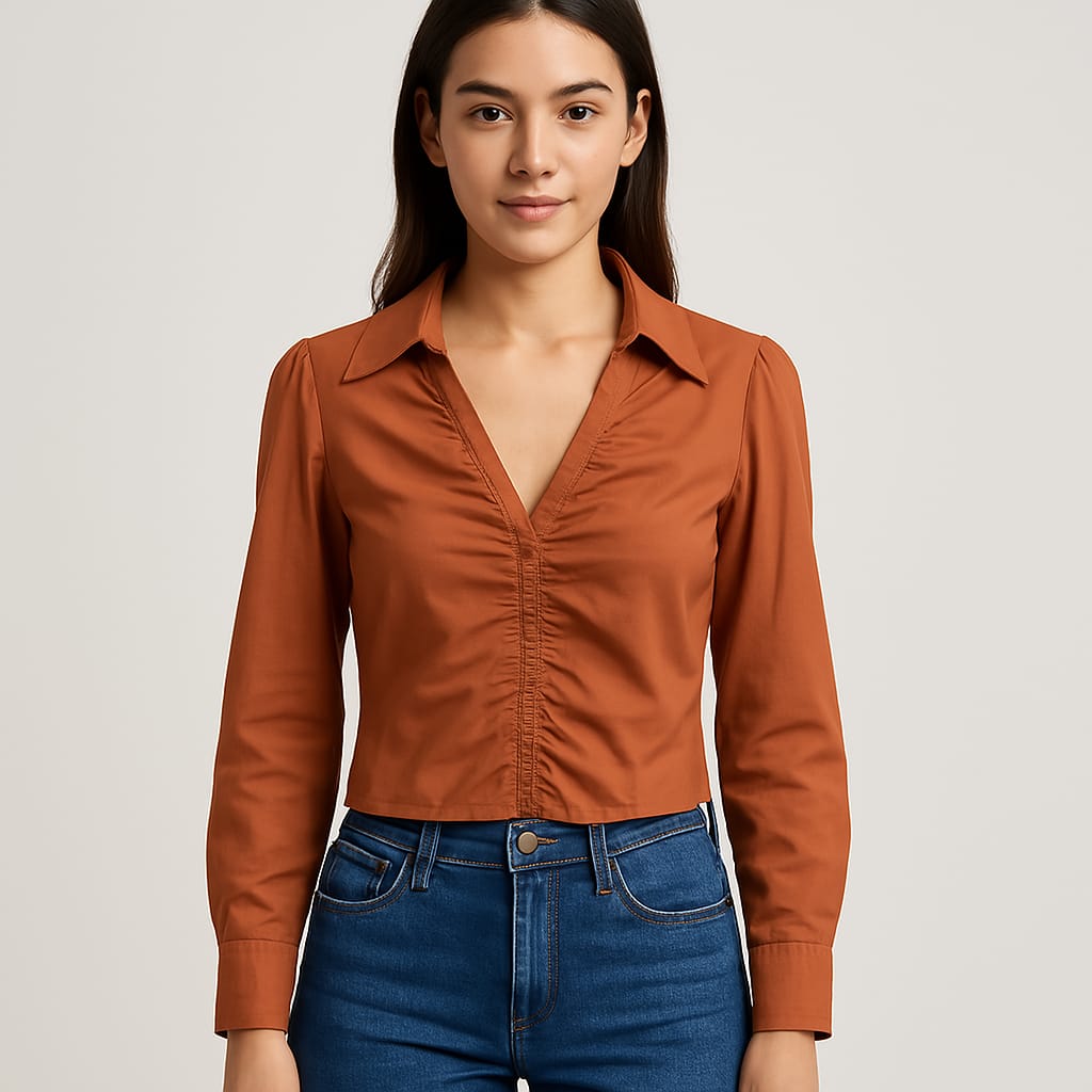 Blusa de seda fría, corta, cierre lateral, escote en V, cuello, manga larga.
